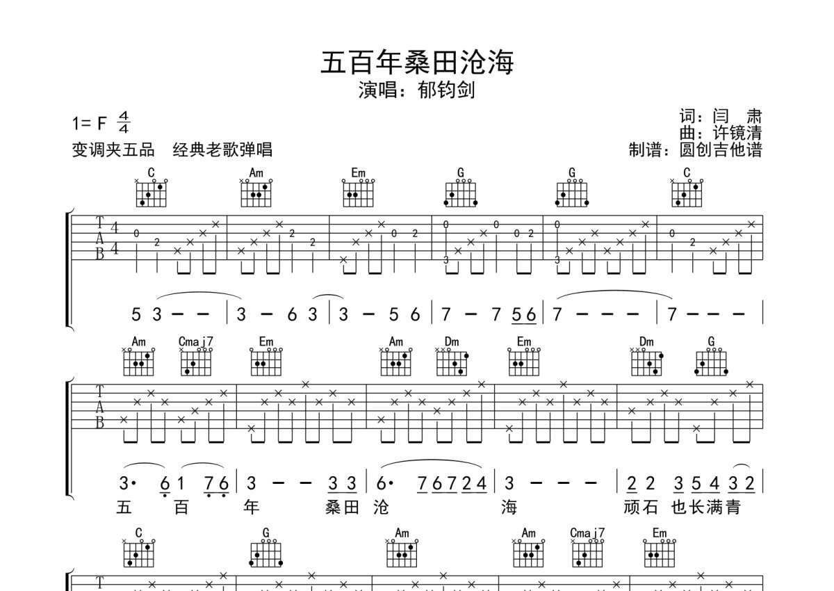 郁钧剑《五百年桑海沧田》吉他谱 - F调弹唱六线谱 - 分解编配