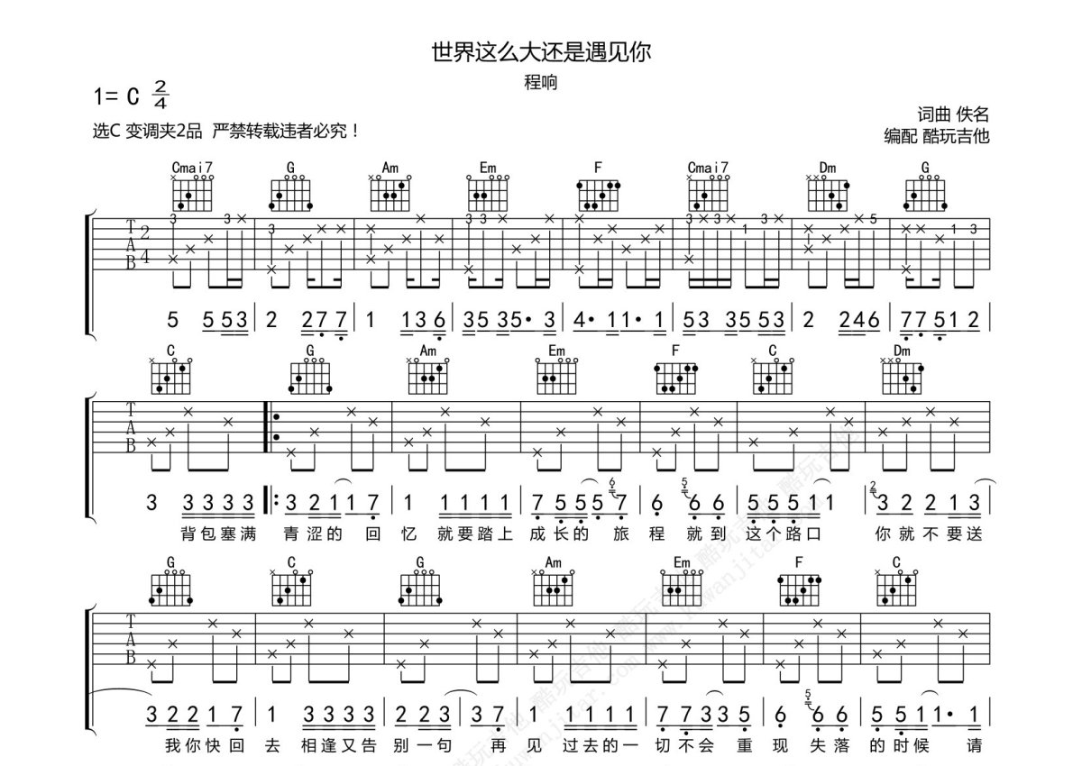 程响《世界这么大还是遇见你》吉他谱 - C调弹唱六线谱