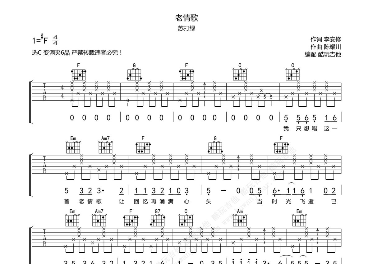 《老情歌》是苏打绿演唱的一首歌曲,本吉他谱采用的是C调指法编配,这份吉他谱共有两张高清图谱,图谱由 @酷玩吉他 编配上传,图谱使用六线谱编配,包含吉他和弦指法、简谱以及歌词部分,曲谱配备了相关的音频提供试听,使用这份老情歌吉他谱,可以让你更加方便地掌握这首歌曲的弹唱技巧,快来尝试吧。苏打绿《老情歌》吉他谱_C调吉他弹唱谱。