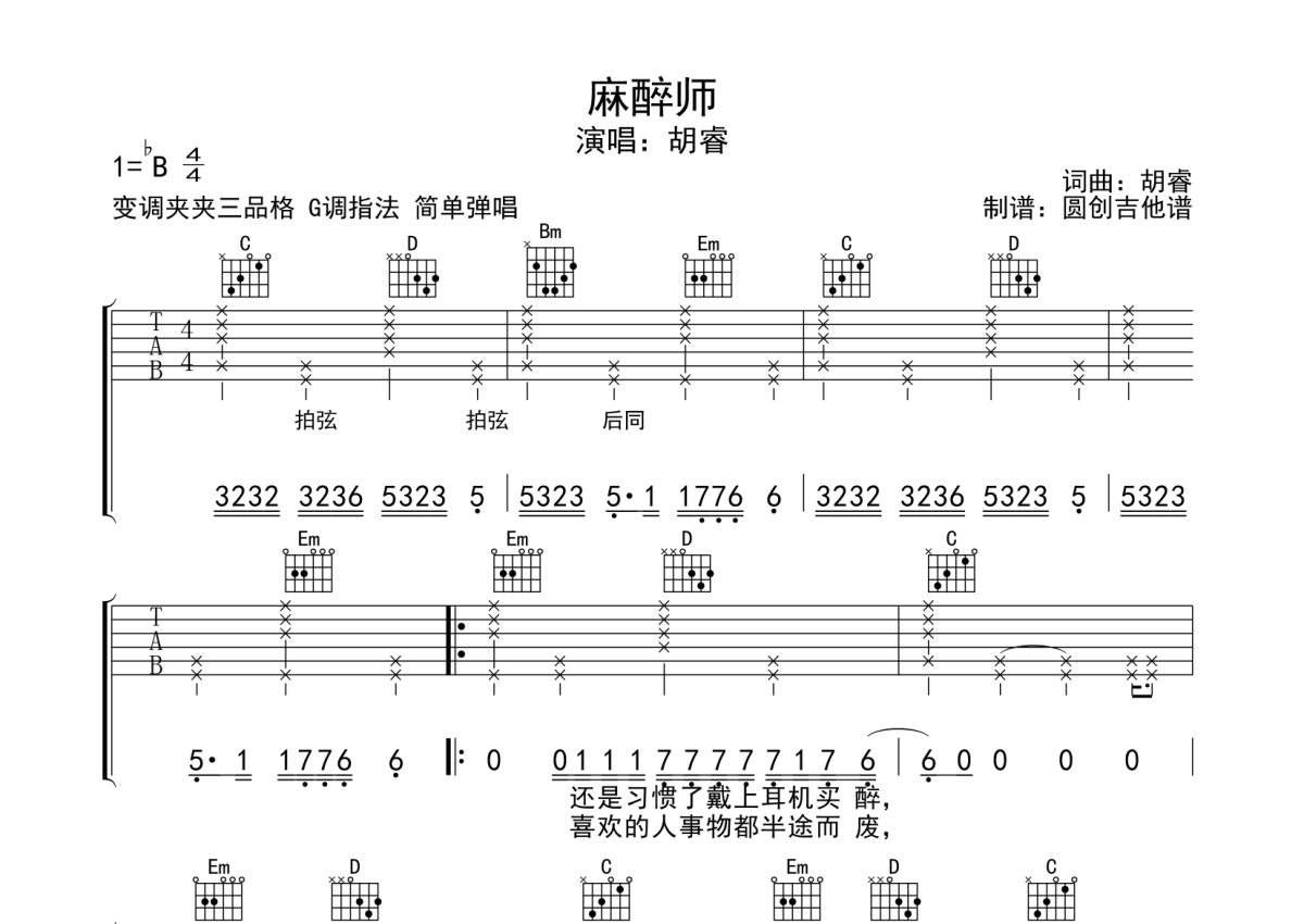 胡睿《麻醉师》吉他谱 - G调弹唱六线谱 - 拍弦版
