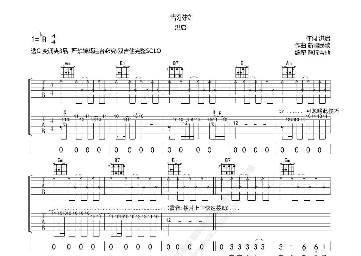 洪启《吉尔拉》吉他谱 - G调弹唱六线谱