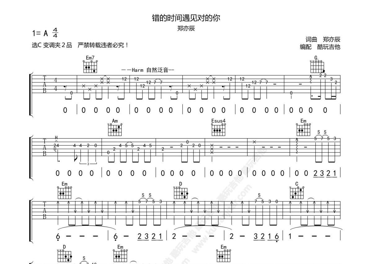 郑亦辰《错的时间遇见对的你》吉他谱 - C调弹唱六线谱 - 原版附SOLO