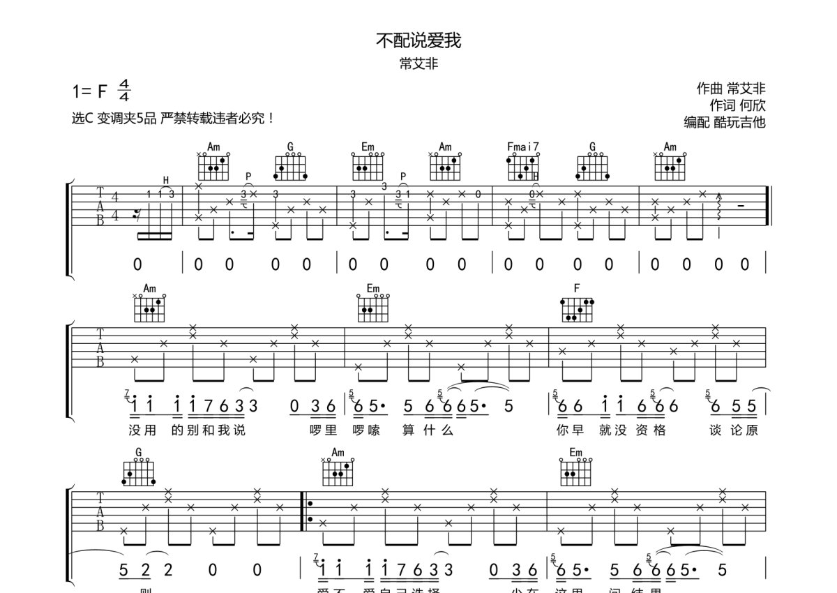 常艾非《不配说爱我》吉他谱 - C调弹唱六线谱