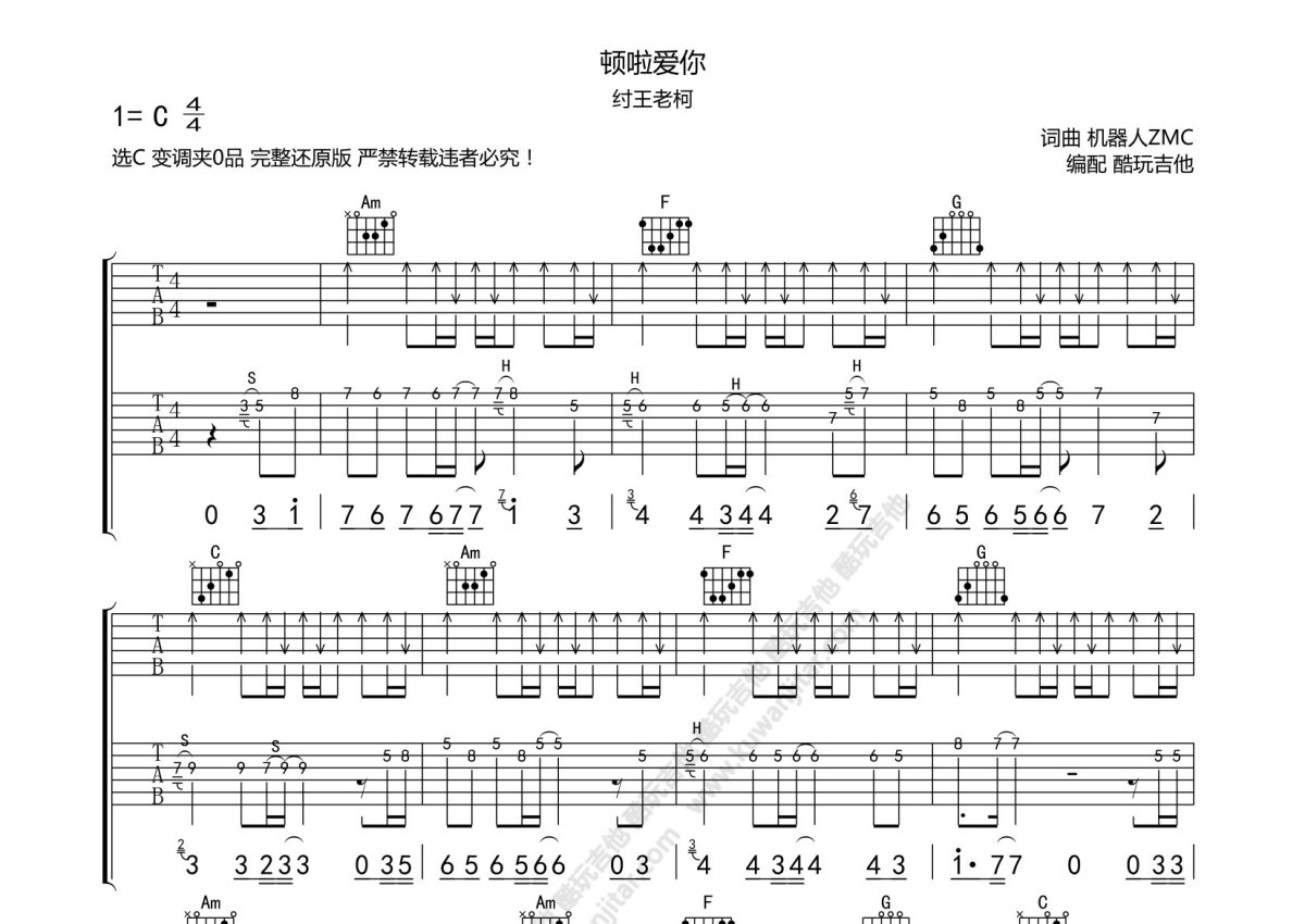 纣王老柯《顿啦爱你》吉他谱 - C调弹唱六线谱