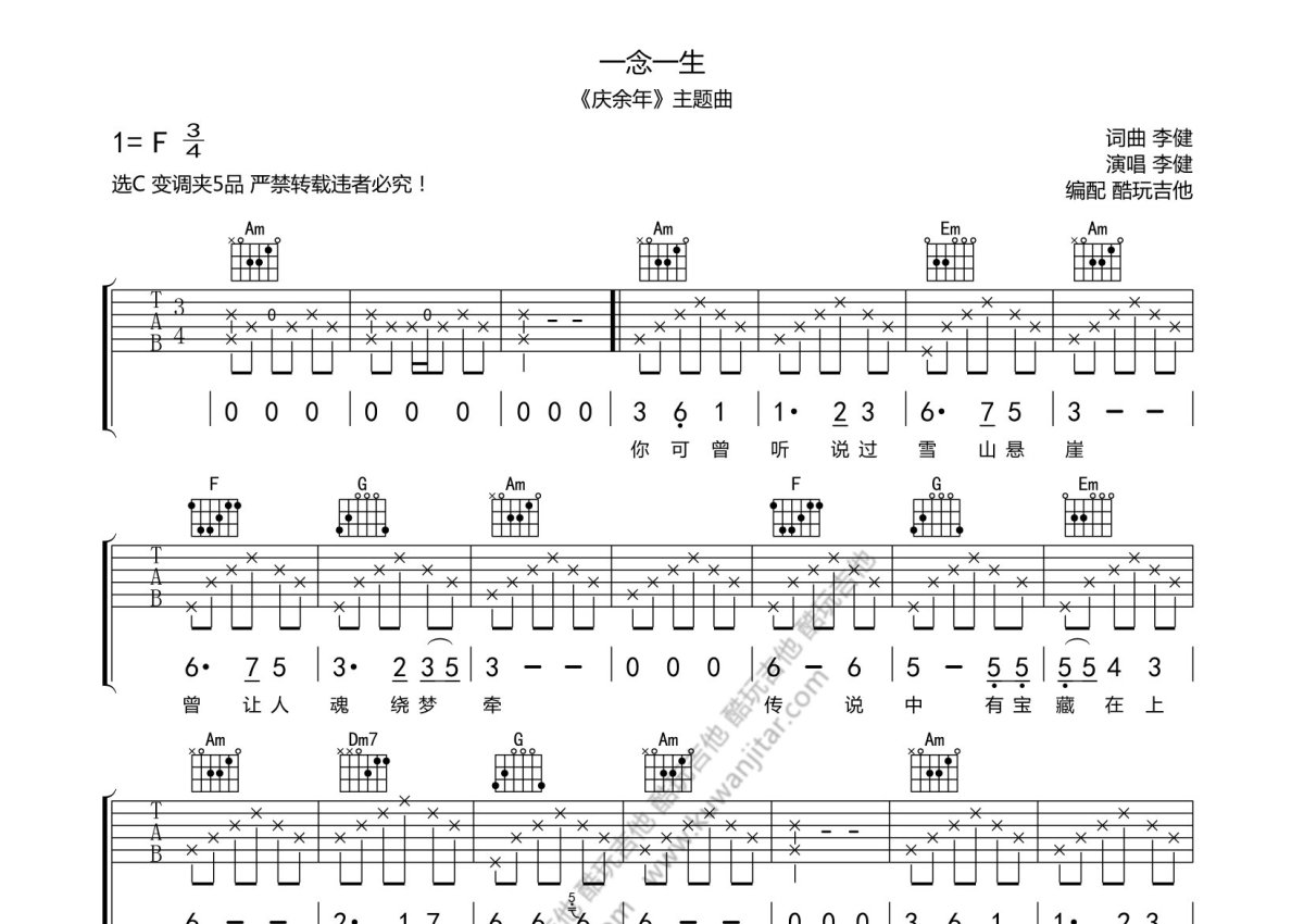 李健《一念一生》吉他谱 - C调弹唱六线谱