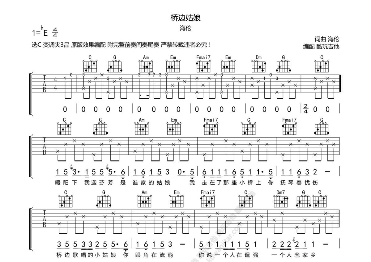 海伦《桥边姑娘》吉他谱 - C调弹唱六线谱