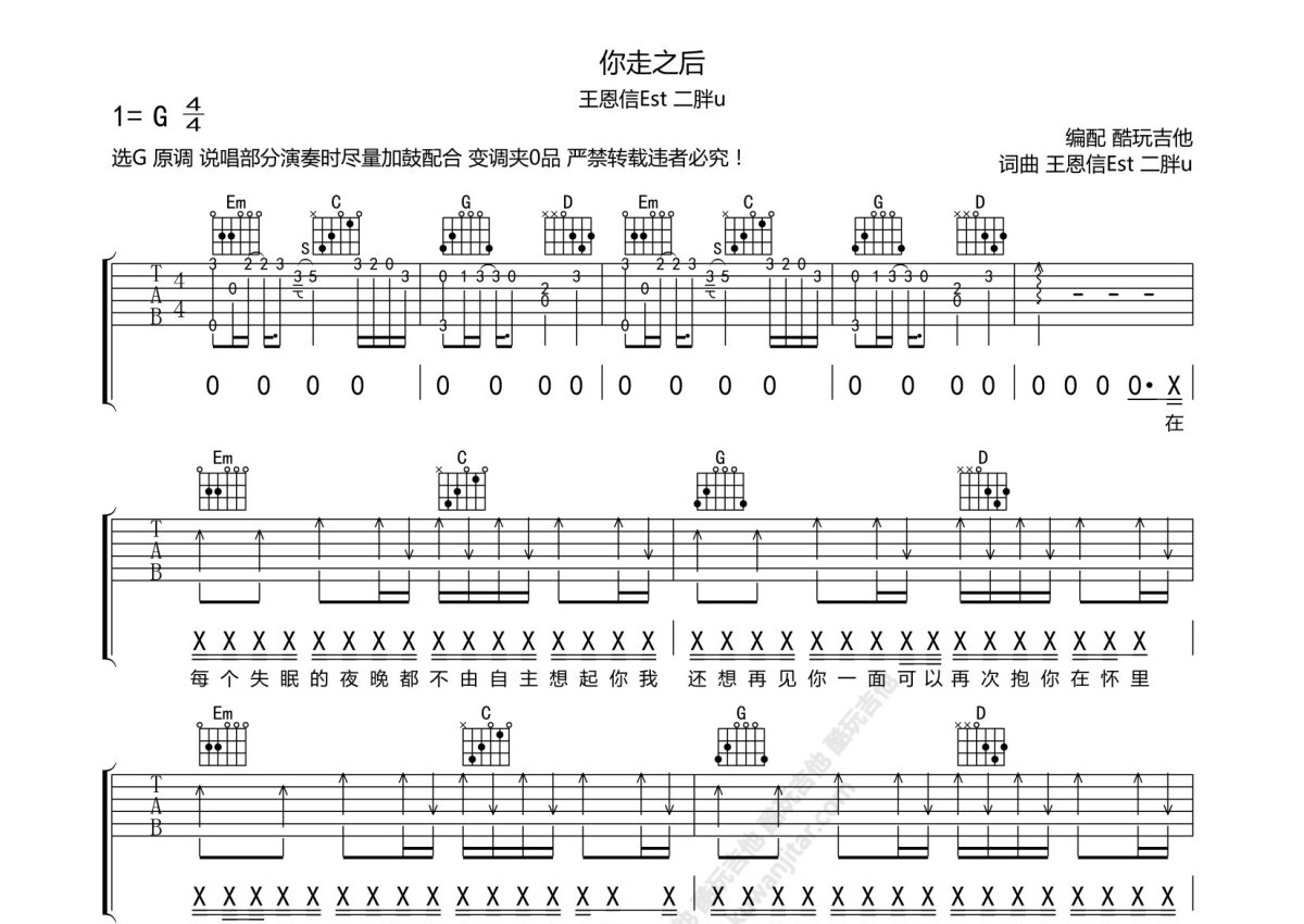 王恩信Est/二胖u《你走以后》吉他谱 - G调弹唱六线谱