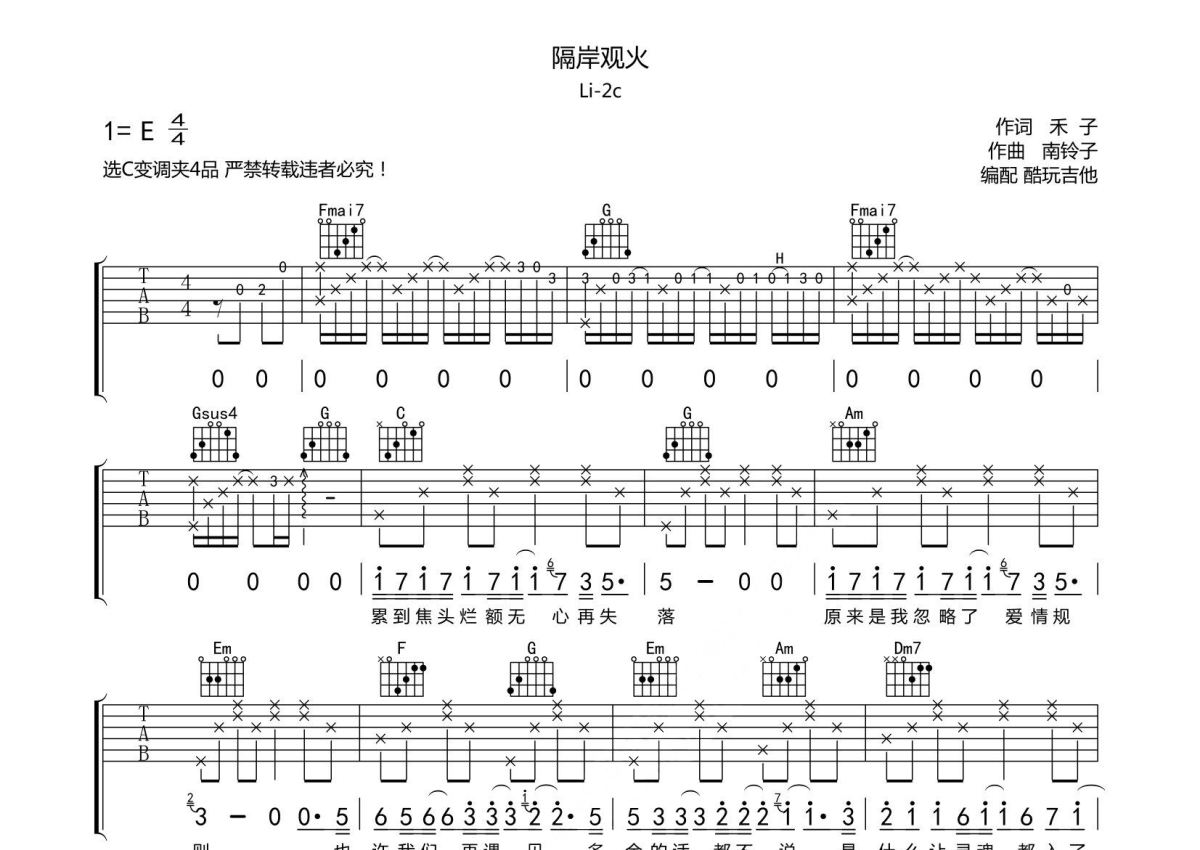 隔岸观火吉他谱 - Li-2c/高源演唱 - C调弹唱六线谱