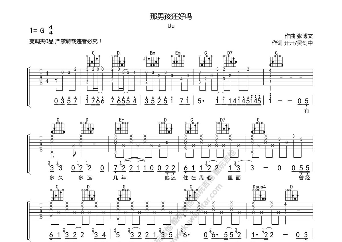 Uu《那男孩还好吗》吉他谱 - G调弹唱六线谱