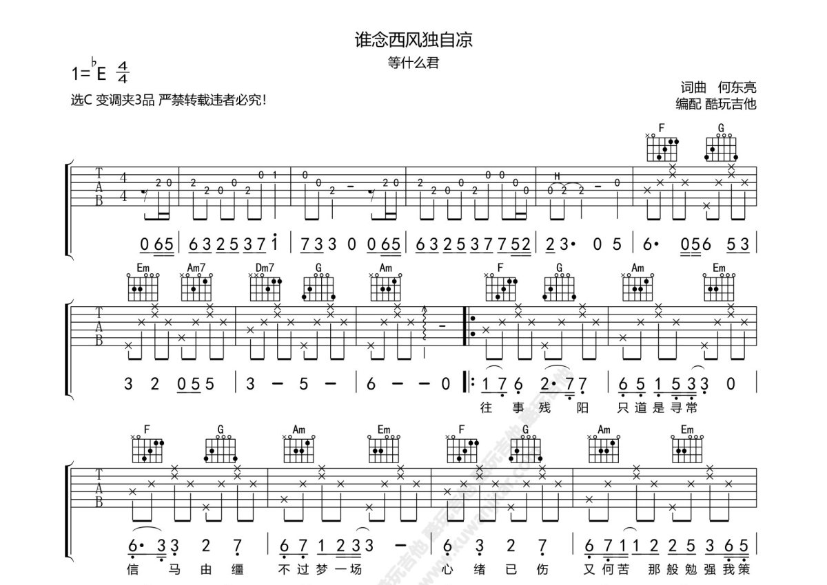 等什么君《谁念西风独自凉》吉他谱 - C调弹唱六线谱