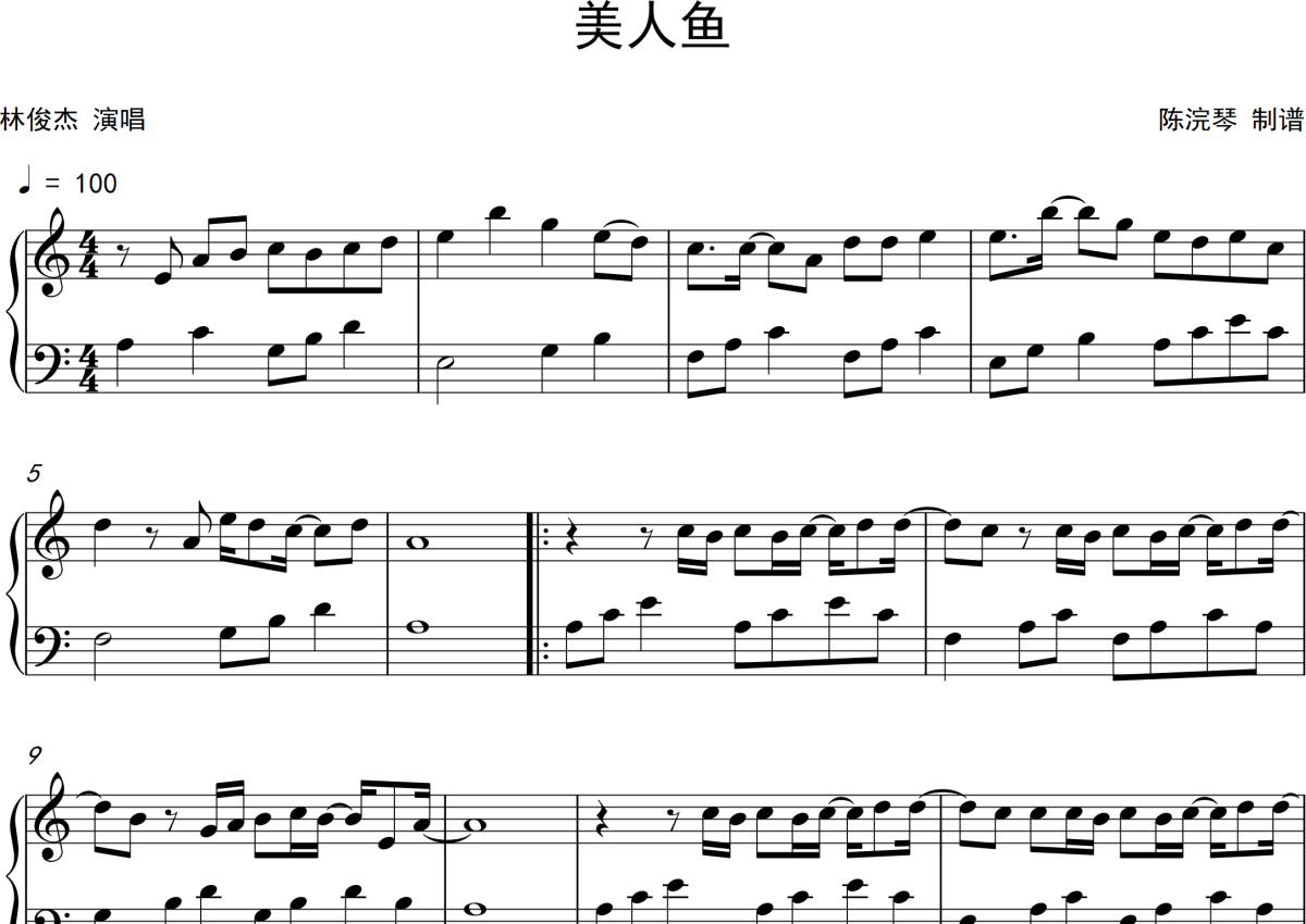 《美人鱼》是林俊杰演唱的一首歌曲,这份钢琴谱共有两张高清图谱,图谱由 @月隐云先知 编配上传,曲谱配备了相关的音频提供试听,使用这份美人鱼钢琴谱,可以让你更加方便地掌握这首歌曲的演奏技巧,快来尝试吧。林俊杰《美人鱼》钢琴谱。
