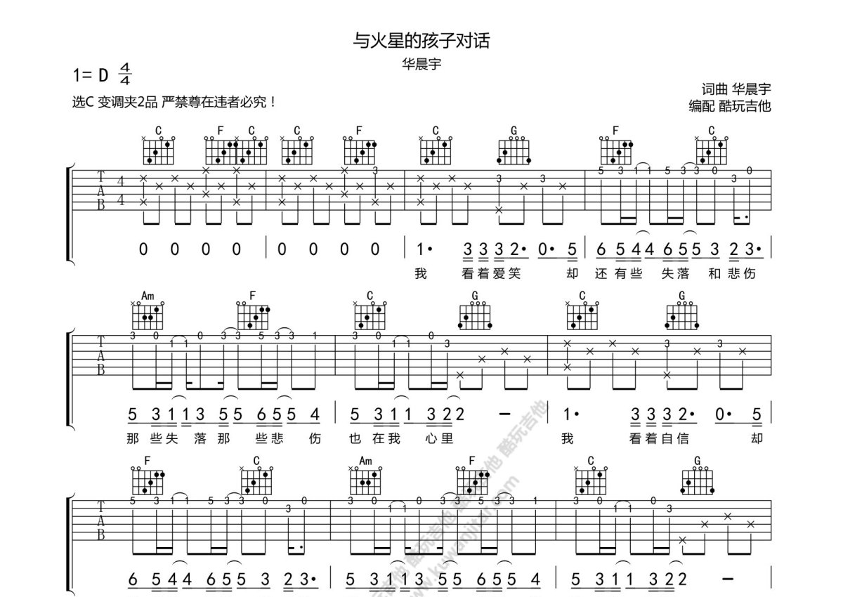 华晨宇《与火星的孩子对话》吉他谱 - C调弹唱六线谱