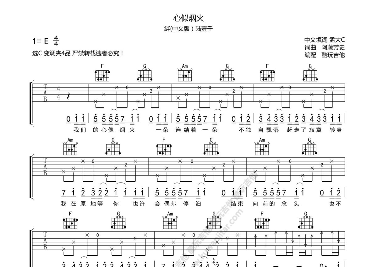 陆壹千《心似烟火》吉他谱 - C调弹唱六线谱 - 中文版