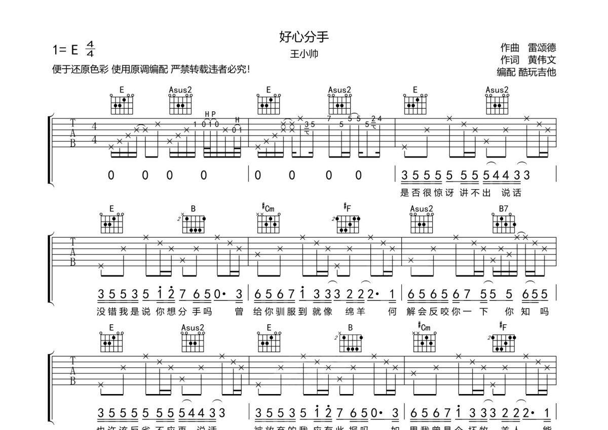王小帅《好心分手》吉他谱 - E调弹唱六线谱