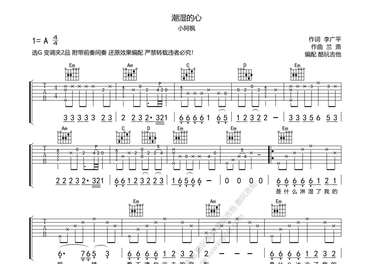 《潮湿的心》是小阿枫演唱的一首歌曲,附带完整前奏间奏,本吉他谱采用的是G调指法编配,这份吉他谱共有两张高清图谱,图谱由 @酷玩吉他 编配上传,图谱使用六线谱编配,包含吉他和弦指法、简谱以及歌词部分,曲谱配备了相关的音频提供试听,使用这份潮湿的心吉他谱,可以让你更加方便地掌握这首歌曲的弹唱技巧,快来尝试吧。小阿枫《潮湿的心》吉他谱_G调吉他弹唱谱_附带完整前奏间奏。