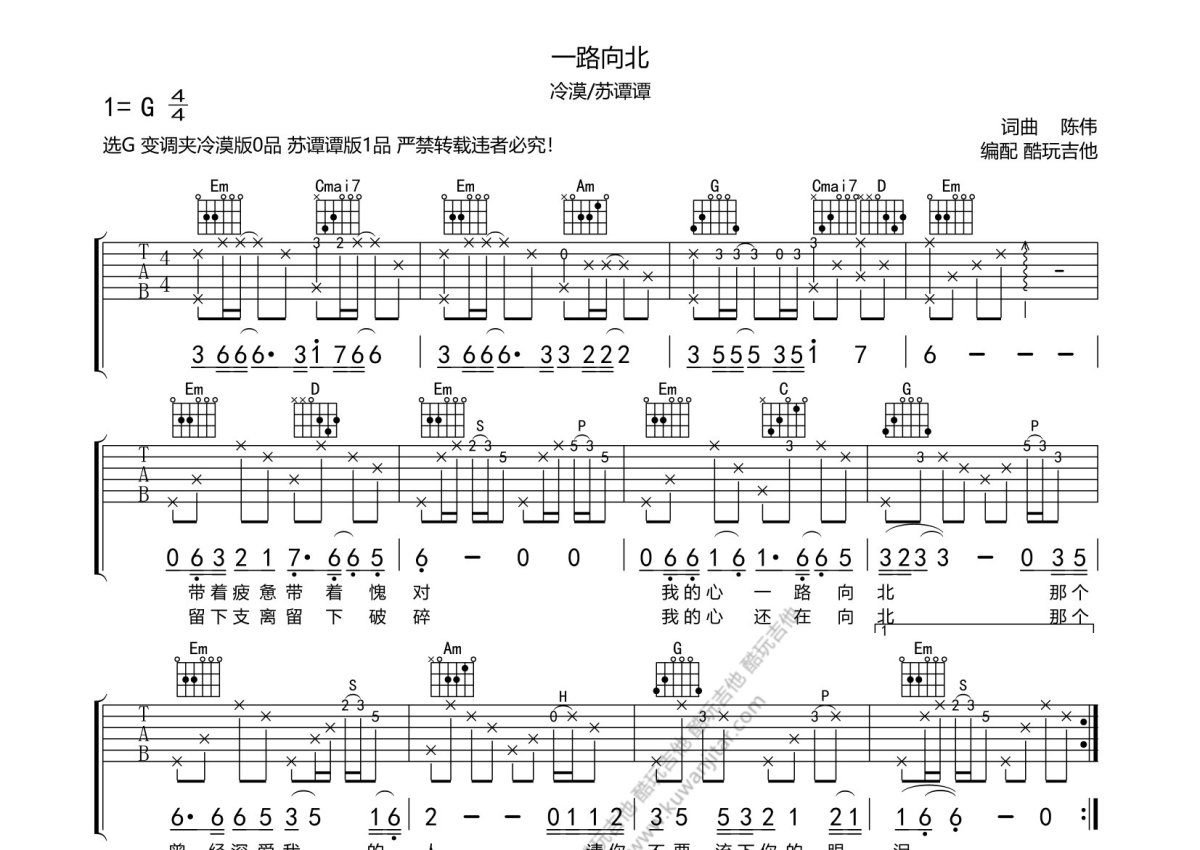 冷漠/苏谭谭《一路向北》吉他谱 - G调弹唱六线谱