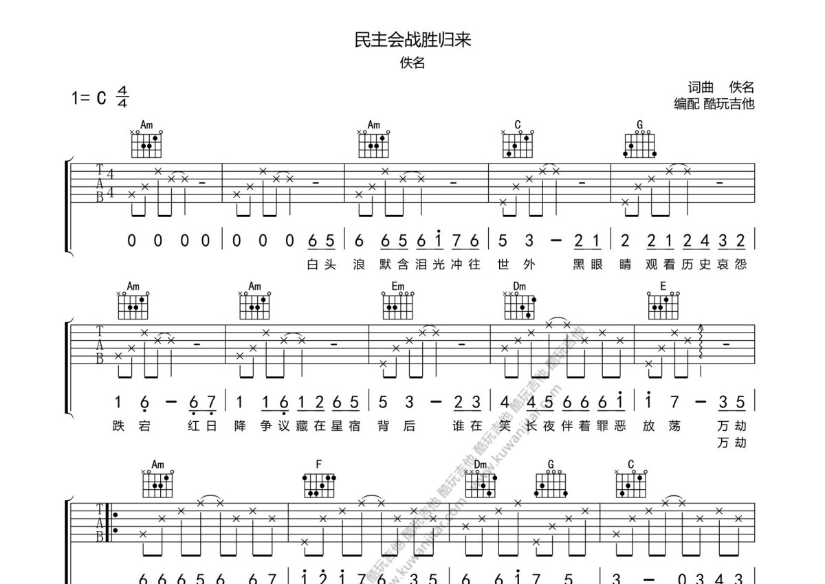 《民主会战胜归来》是佚名演唱的一首歌曲,本吉他谱采用的是C调指法编配,这份吉他谱共有四张高清图谱,图谱由 @酷玩吉他 编配上传,图谱使用六线谱编配,包含吉他和弦指法、简谱以及歌词部分,曲谱配备了相关的音频提供试听,使用这份民主会战胜归来吉他谱,可以让你更加方便地掌握这首歌曲的弹唱技巧,快来尝试吧。佚名《民主会战胜归来》吉他谱_C调吉他弹唱谱。