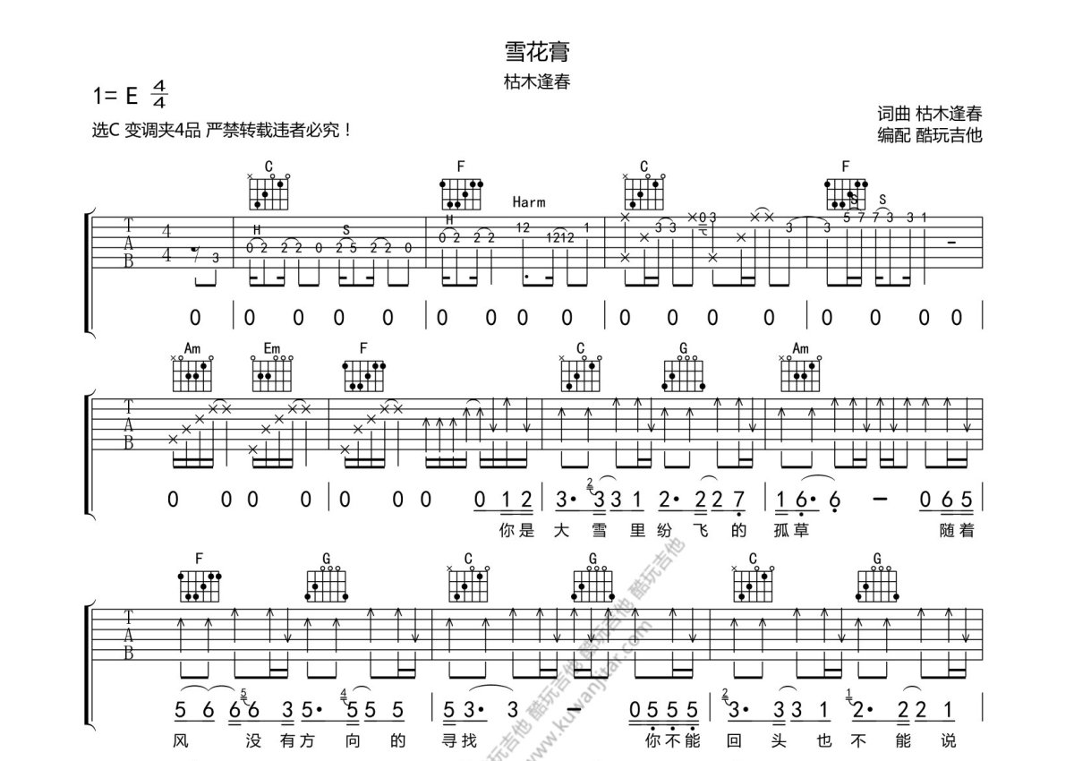 枯木逢春《雪花膏》吉他谱 - C调弹唱六线谱