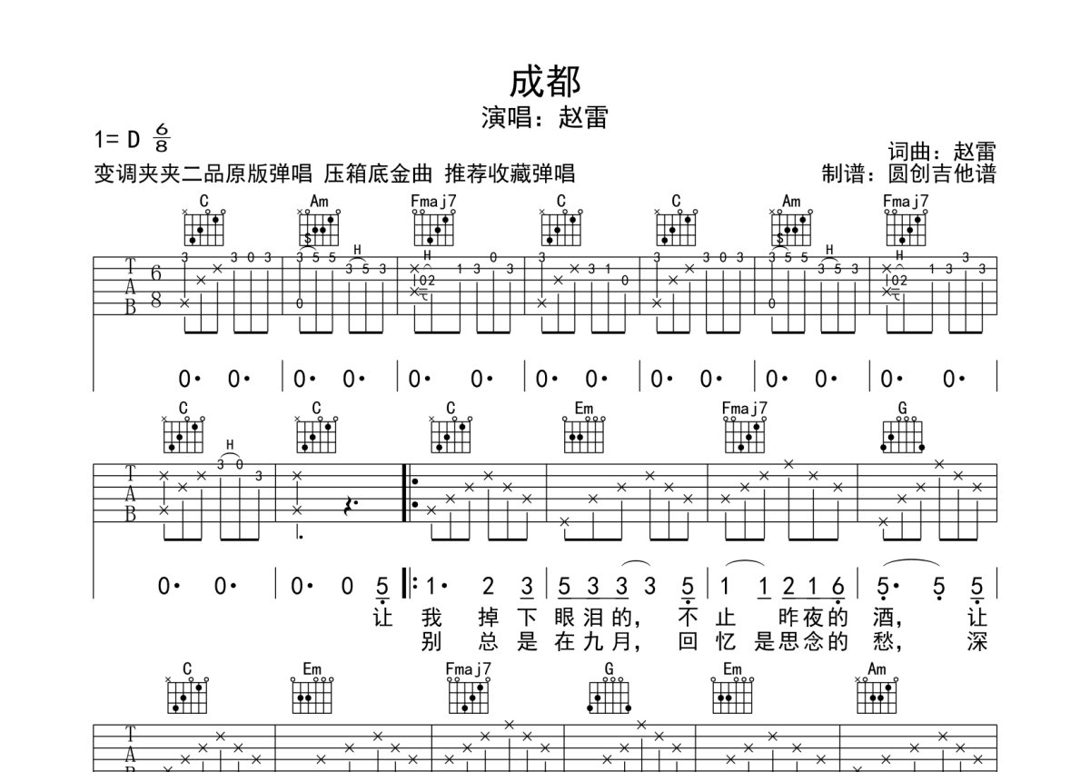 《成都》是赵雷演唱的一首歌曲,分解编配原版编配,本吉他谱采用的是C调指法编配,这份吉他谱共有两张高清图谱,图谱由 @圆创吉他谱 编配上传,图谱使用六线谱编配,包含吉他和弦指法、简谱以及歌词部分,曲谱配备了相关的音频提供试听,使用这份成都吉他谱,可以让你更加方便地掌握这首歌曲的弹唱技巧,快来尝试吧。原版太弹唱 推荐。