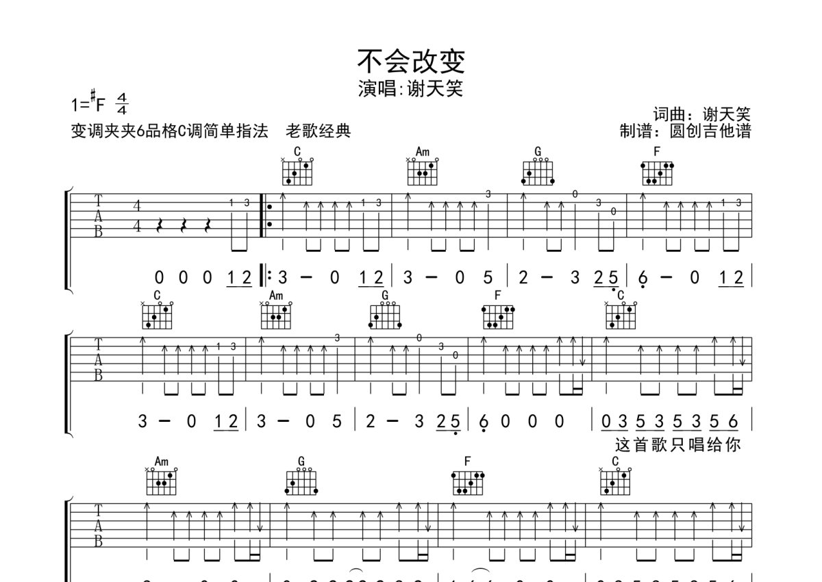 谢天笑《不会改变》吉他谱 - C调弹唱六线谱 - 扫弦编配原版编配