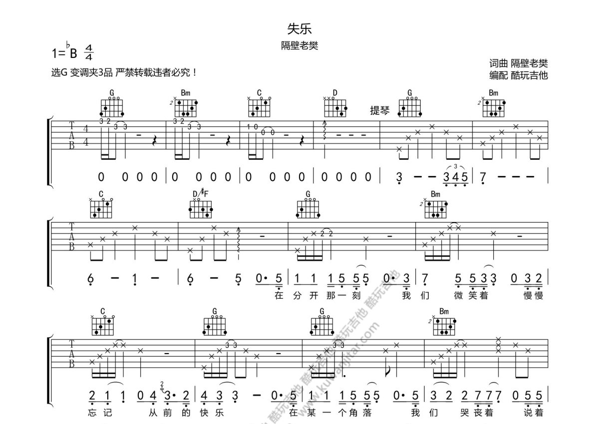 隔壁老樊《失乐》吉他谱 - G调弹唱六线谱