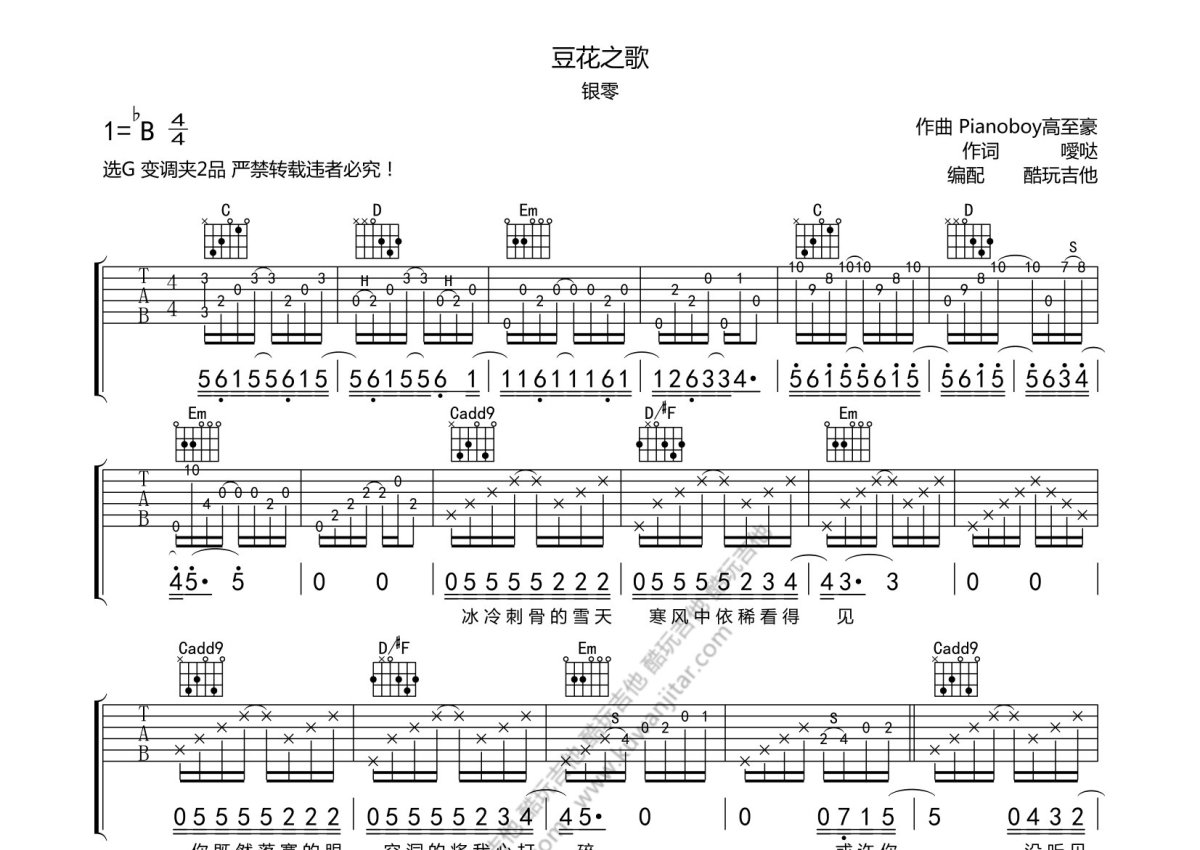 银零《豆花之歌》吉他谱 - G调弹唱六线谱
