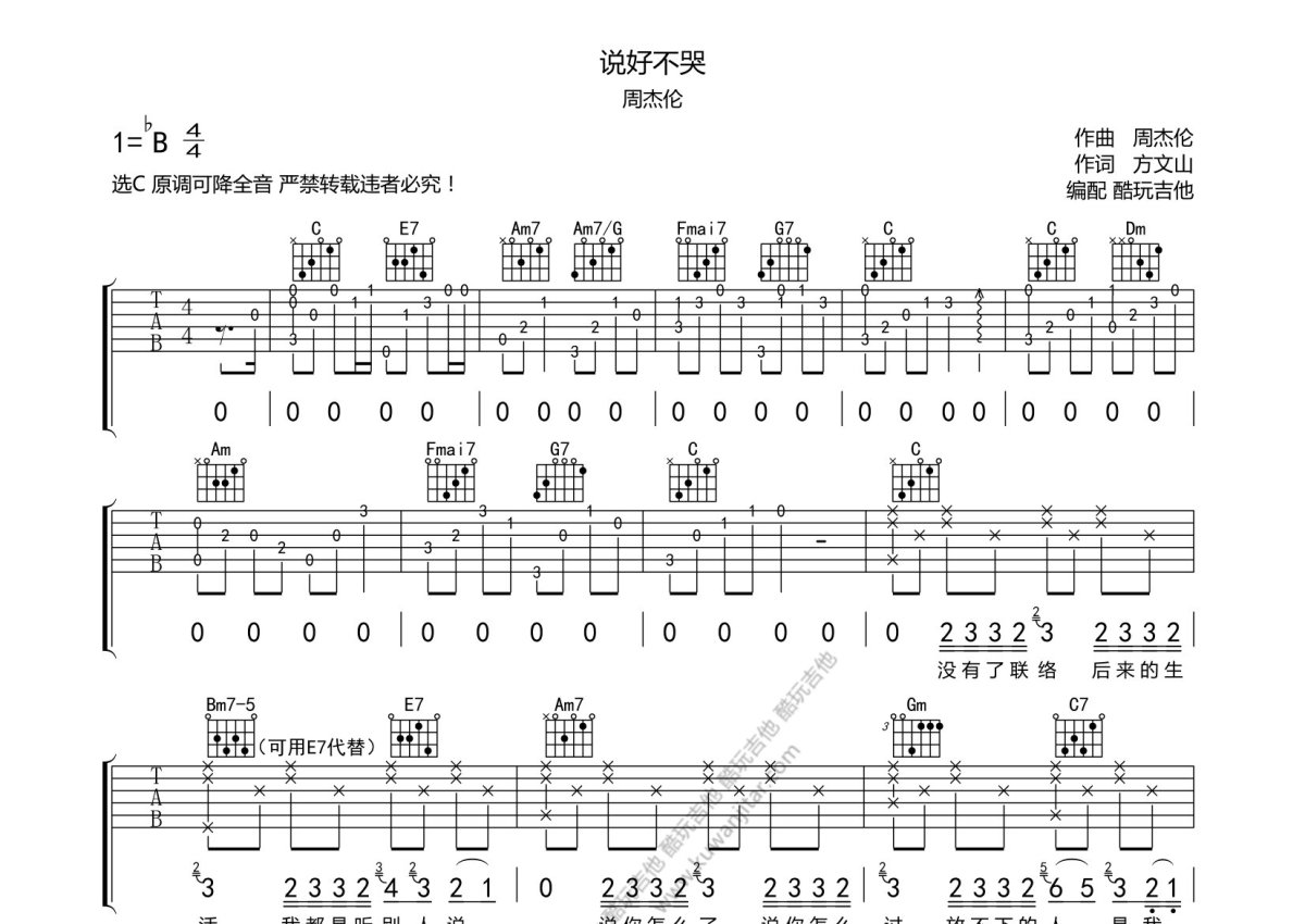 《说好不哭》是周杰伦演唱的一首歌曲,本吉他谱采用的是C调指法编配,这份吉他谱共有三张高清图谱,图谱由 @酷玩吉他 编配上传,图谱使用六线谱编配,包含吉他和弦指法、简谱以及歌词部分,曲谱配备了相关的音频提供试听,使用这份说好不哭吉他谱,可以让你更加方便地掌握这首歌曲的弹唱技巧,快来尝试吧。周杰伦《说好不哭》吉他谱_C调吉他弹唱谱。