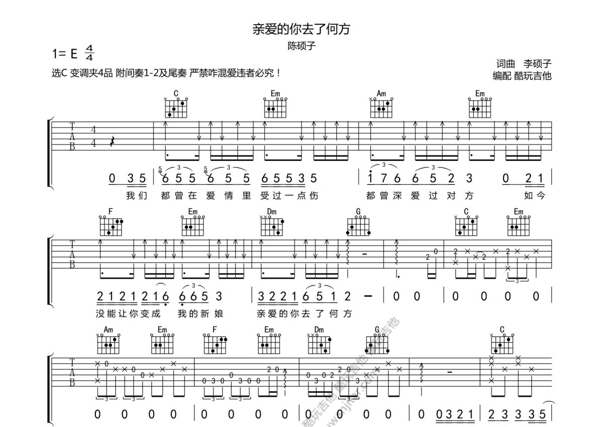 陈硕子《亲爱的你去了何方》吉他谱 - C调弹唱六线谱