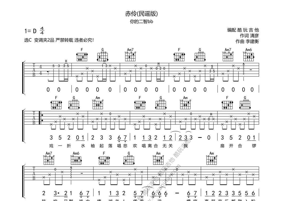 《赤伶民谣版》是你的二智bb演唱的一首歌曲,本吉他谱采用的是C调指法编配,这份吉他谱共有两张高清图谱,图谱由 @酷玩吉他 编配上传,图谱使用六线谱编配,包含吉他和弦指法、简谱以及歌词部分,曲谱配备了相关的音频提供试听,使用这份赤伶民谣版吉他谱,可以让你更加方便地掌握这首歌曲的弹唱技巧,快来尝试吧。你的二智bb《赤伶民谣版》吉他谱_C调吉他弹唱谱。