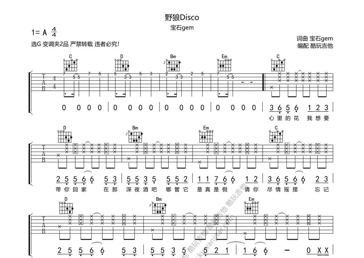 宝石gem《野狼Dsico》吉他谱 - G调弹唱六线谱