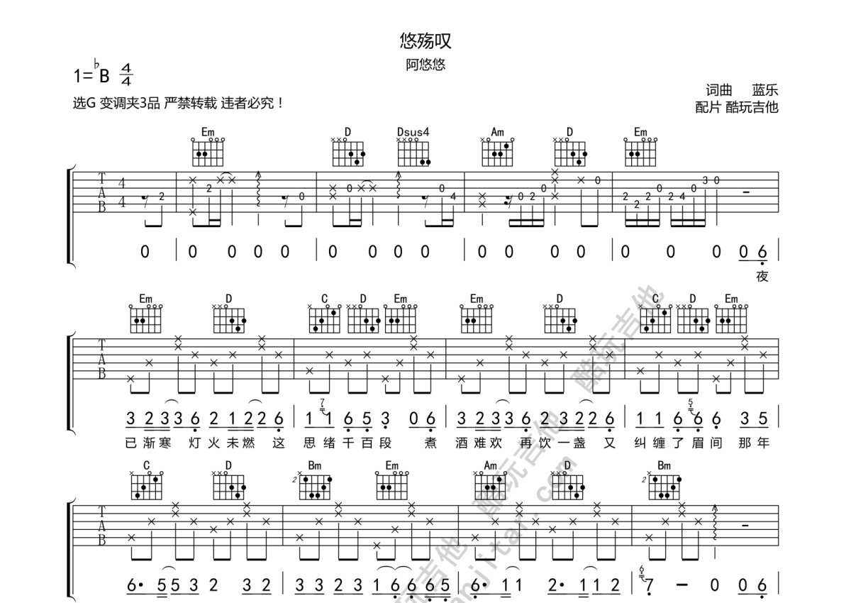 阿悠悠《悠殇叹》吉他谱 - G调弹唱六线谱