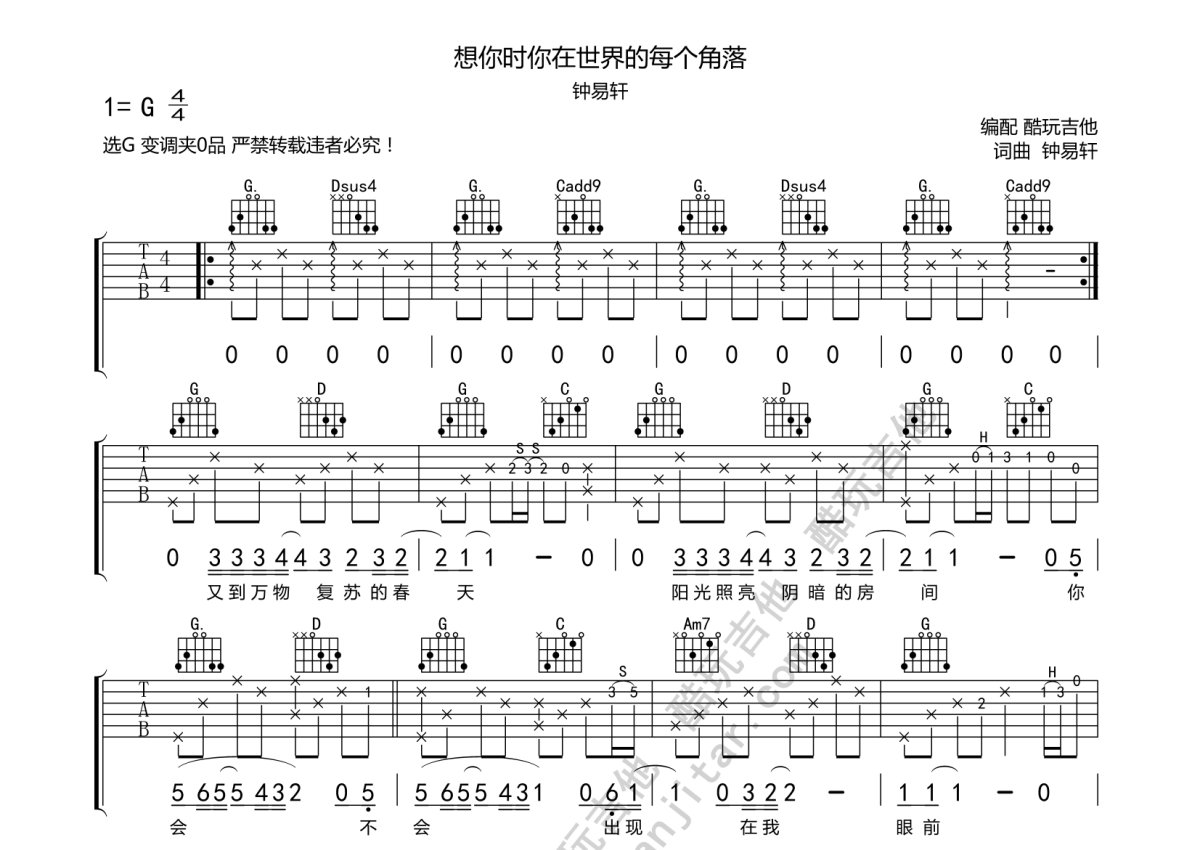 钟易轩《想你时在你世界里的每个角落》吉他谱 - G调弹唱六线谱