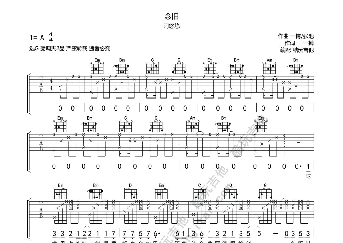 阿悠悠《念旧》吉他谱 - G调弹唱六线谱