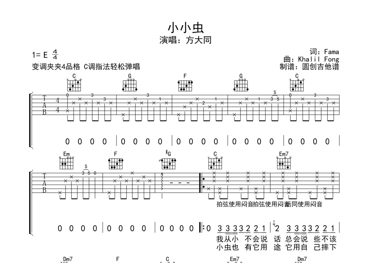 方大同《小小虫》吉他谱 - E调弹唱六线谱 - 分解加扫弦编配原版编配