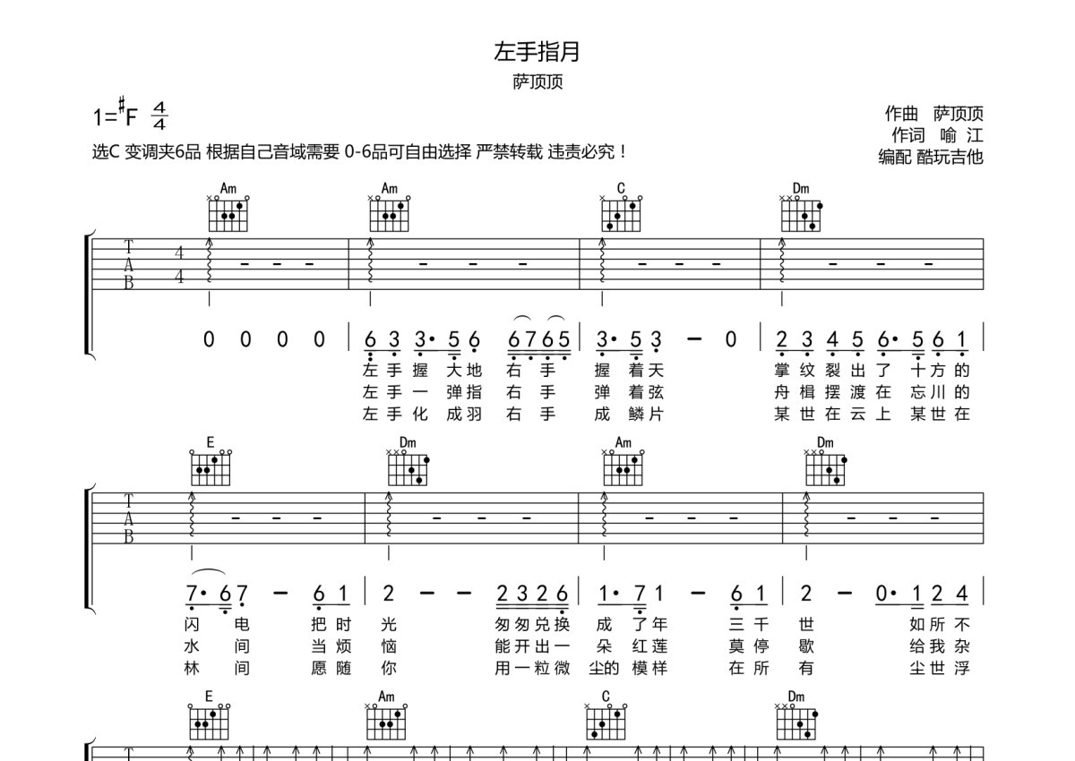 萨顶顶《左手指月》吉他谱 - C调弹唱六线谱 - 初级版