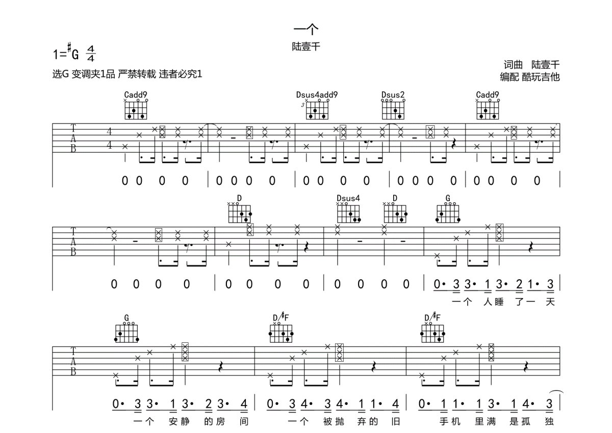 陆壹千《一个》吉他谱 - G调弹唱六线谱