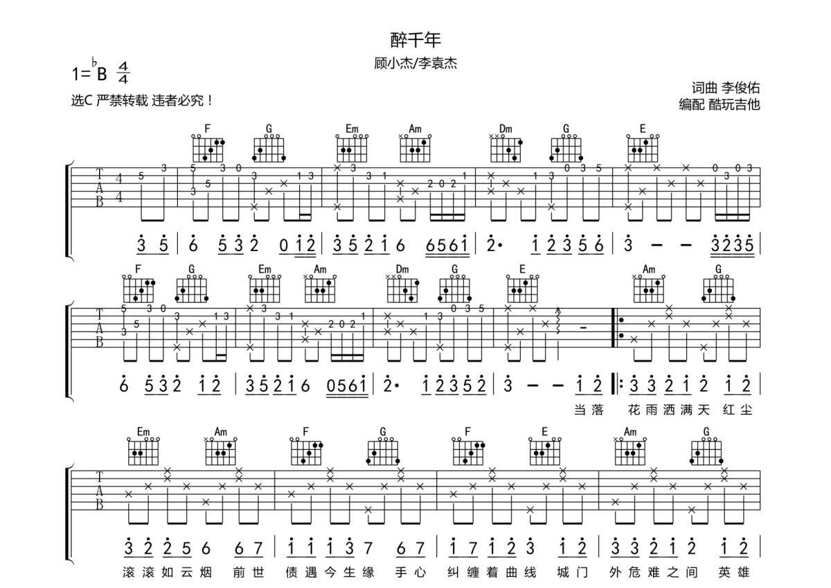 顾小杰/李袁杰《醉千年》吉他谱 - C调弹唱六线谱