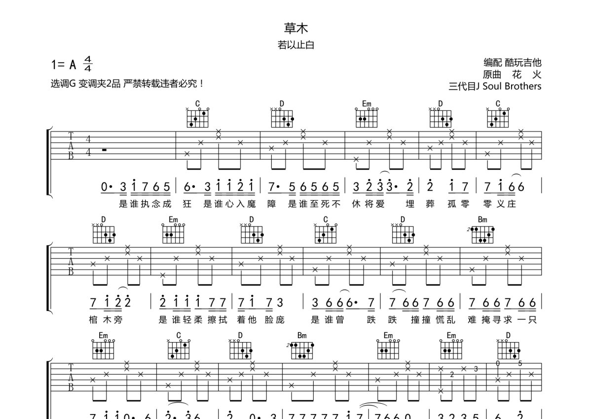 若以止白《草木》吉他谱 - G调弹唱六线谱