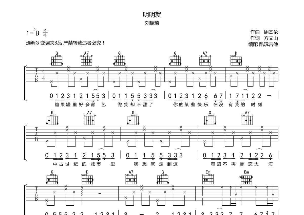 刘瑞琦《明明就》吉他谱 - G调弹唱六线谱