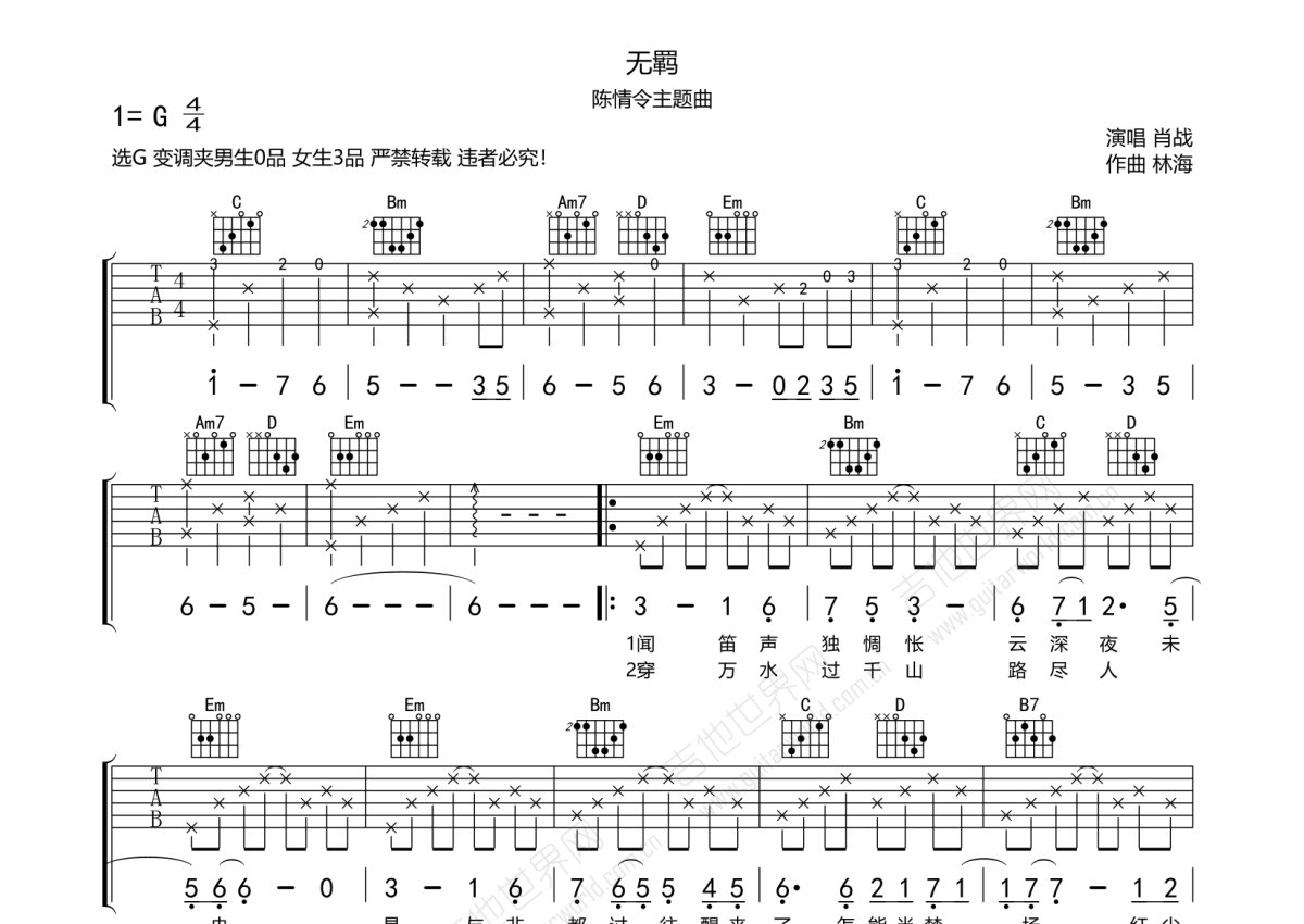 陈情令主题曲《无羁》吉他谱 - G调弹唱六线谱