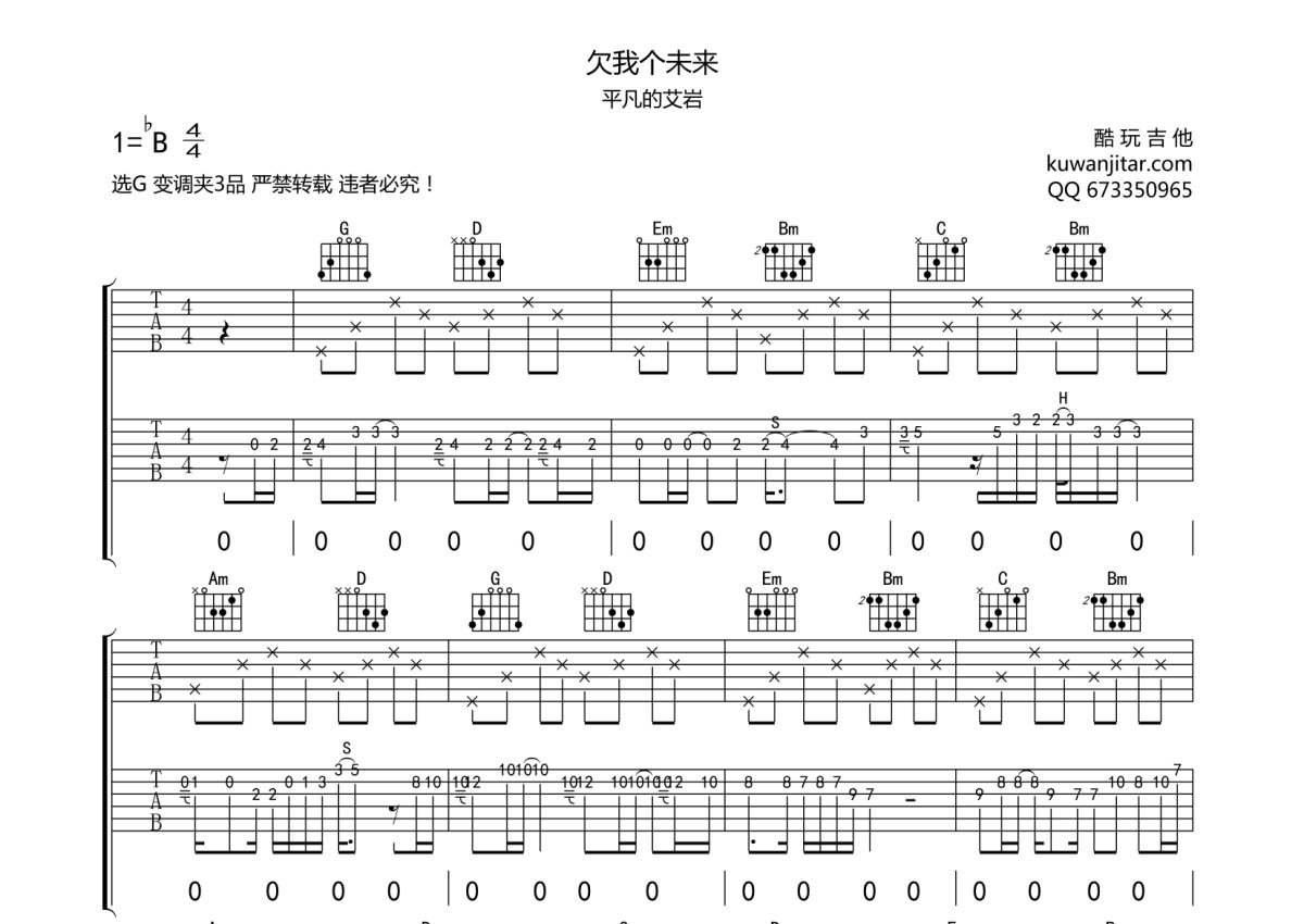平凡的艾岩《欠我个未来》吉他谱 - G调弹唱六线谱 - 双吉他版