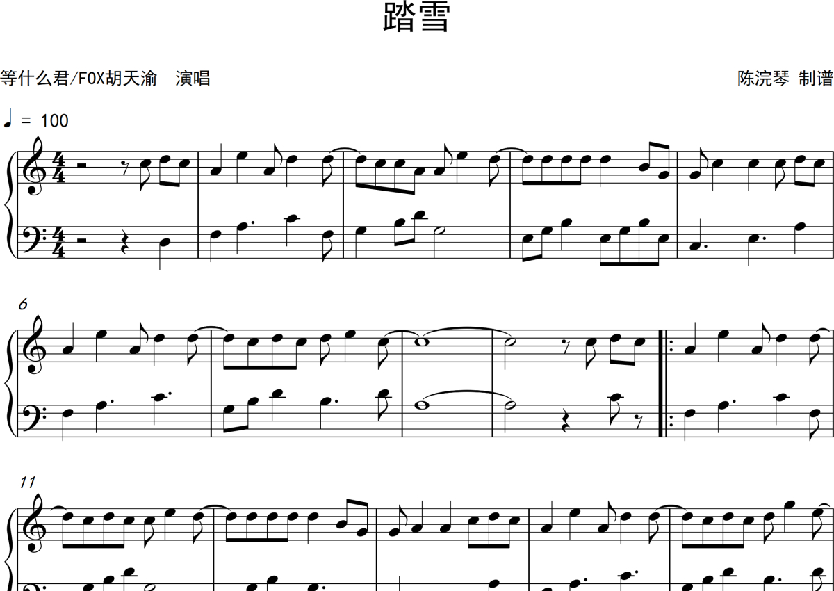 等什么君(邓寓君)/FOX胡天渝《踏雪》钢琴谱