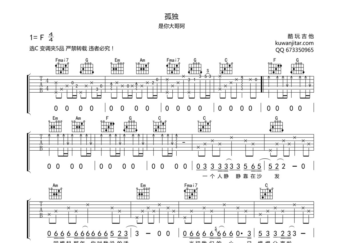 是你大哥阿《孤独》吉他谱 - C调弹唱六线谱