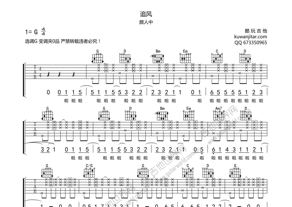 颜人中《追风》吉他谱 - G调弹唱六线谱
