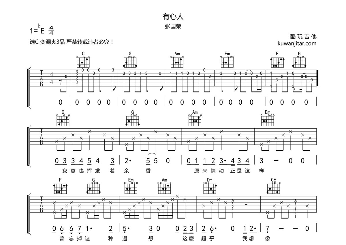 张国荣《有心人》吉他谱 - C调弹唱六线谱