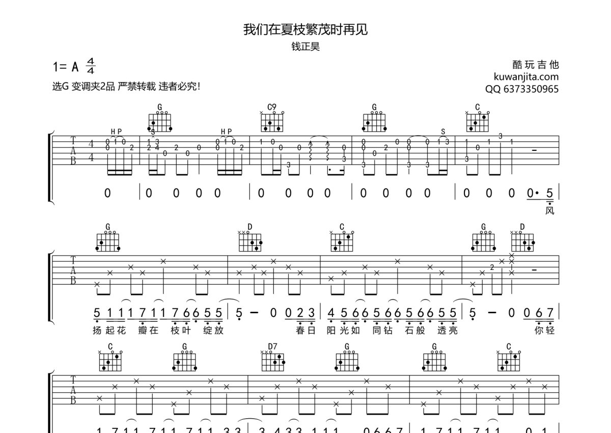钱正昊《我们在夏枝繁茂时再见》吉他谱 - G调弹唱六线谱