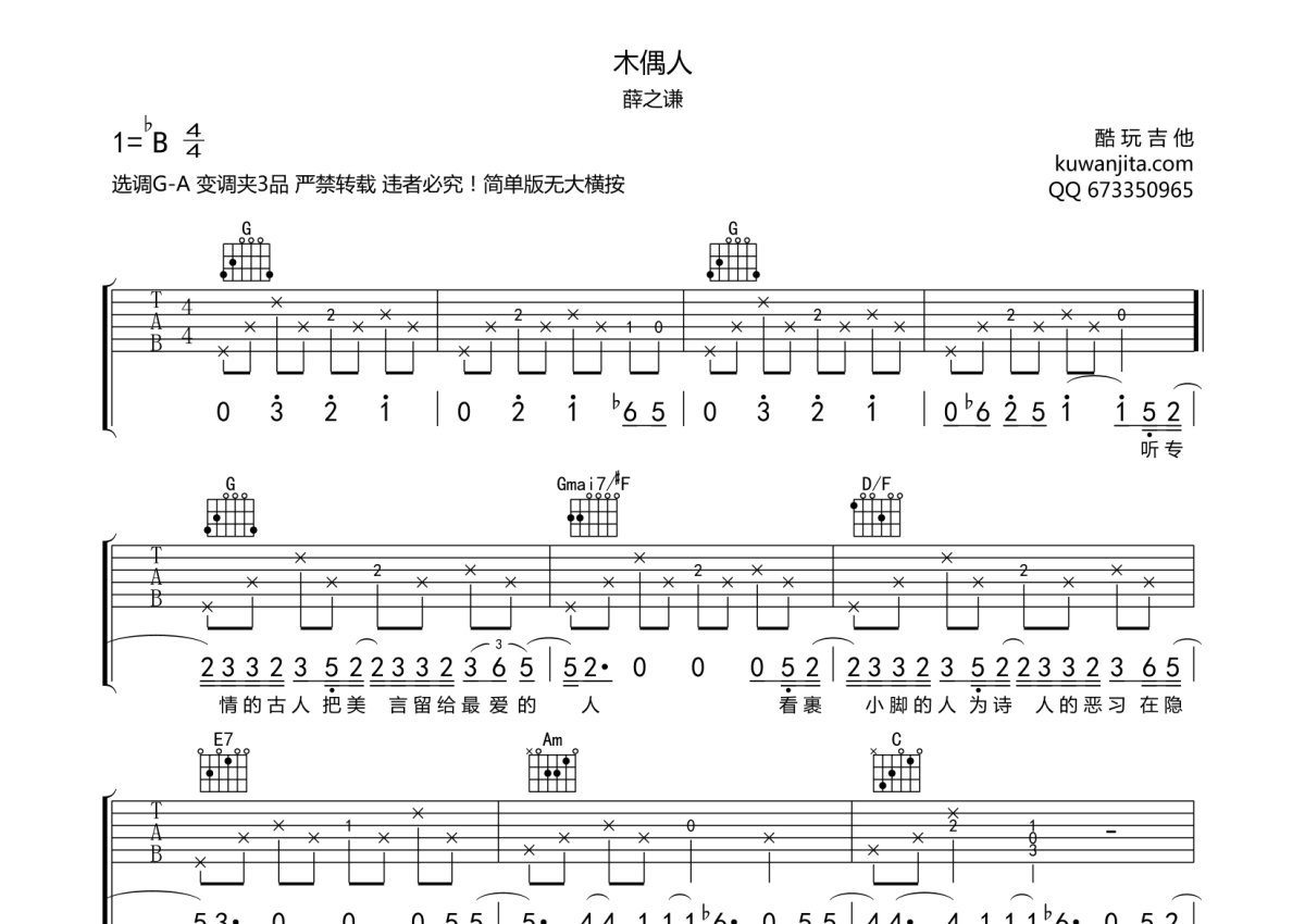 薛之谦《木偶人》吉他谱 - G调弹唱六线谱
