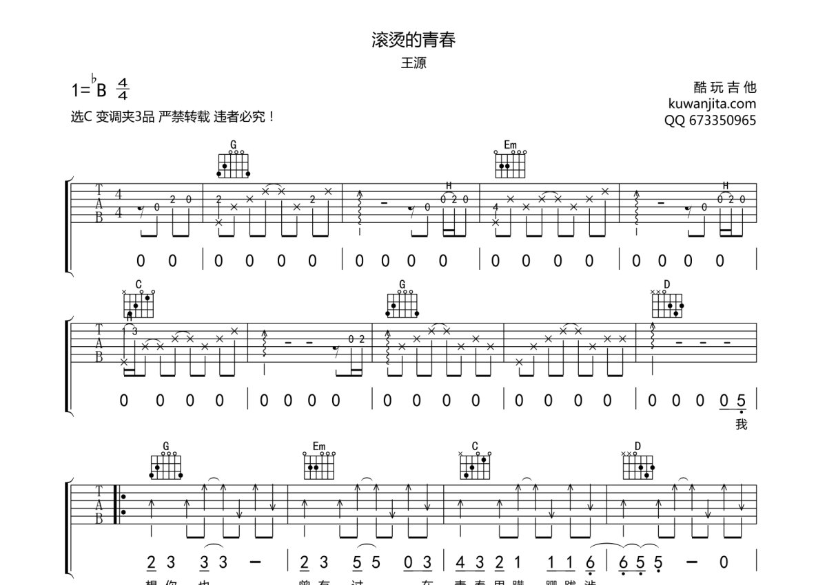王源《滚烫的青春》吉他谱 - C调弹唱六线谱
