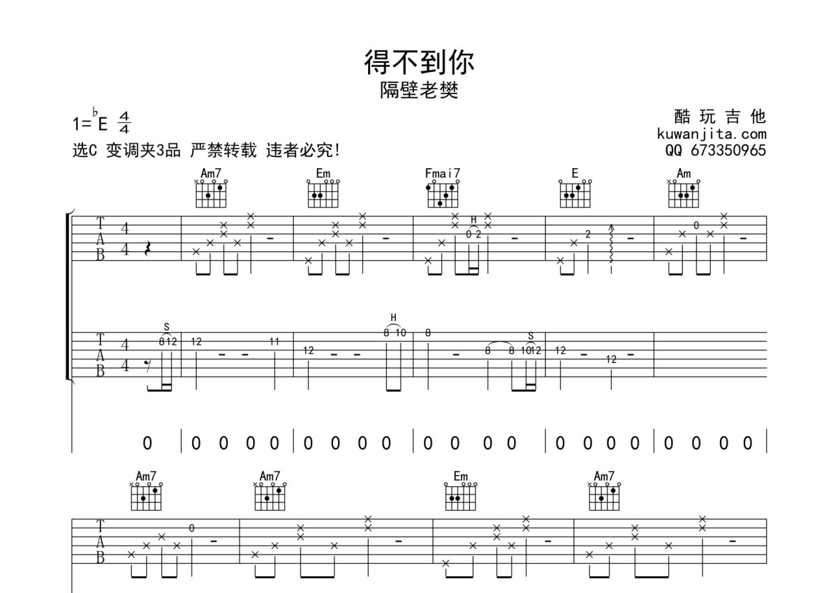 隔壁老樊《得不到你》吉他谱 - C调弹唱六线谱