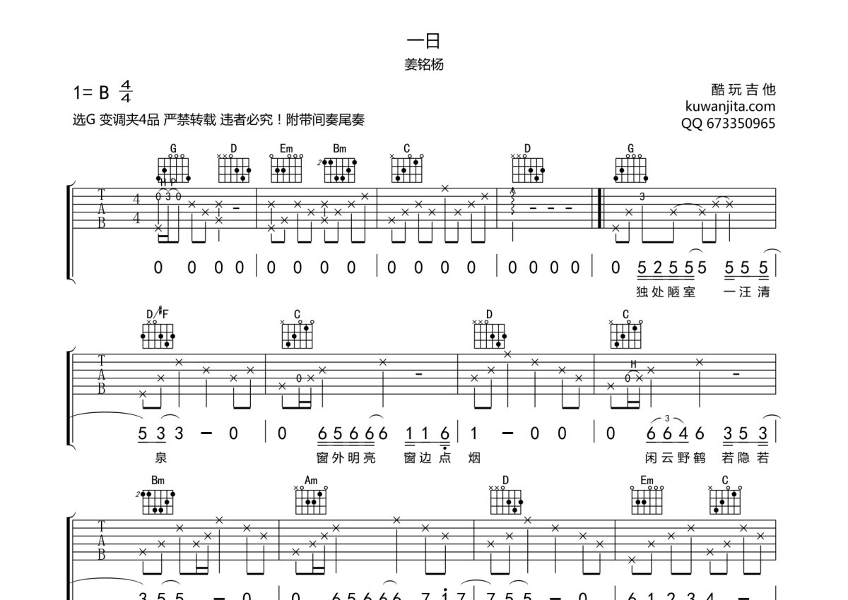 姜铭杨《一日》吉他谱 - G调弹唱六线谱